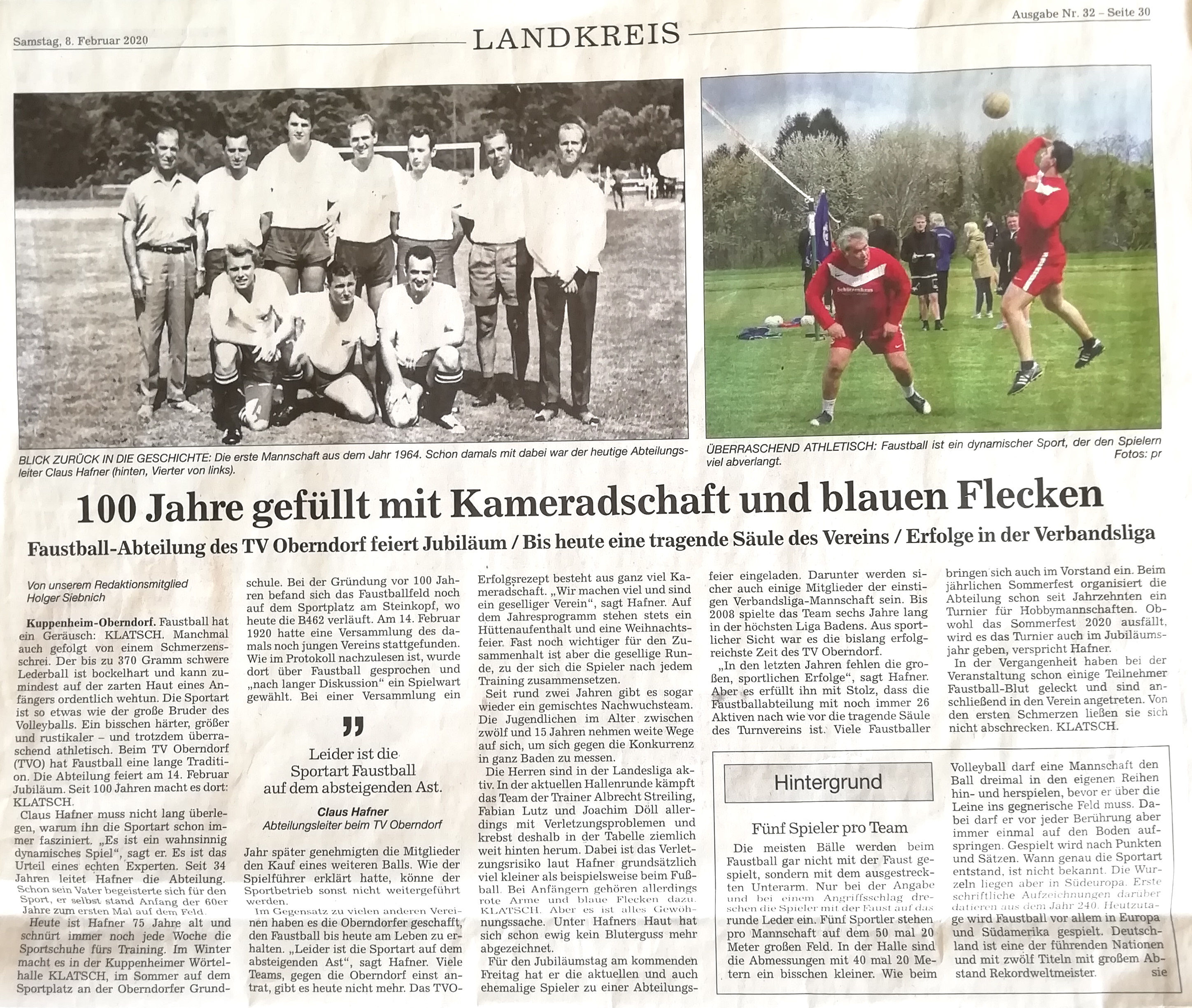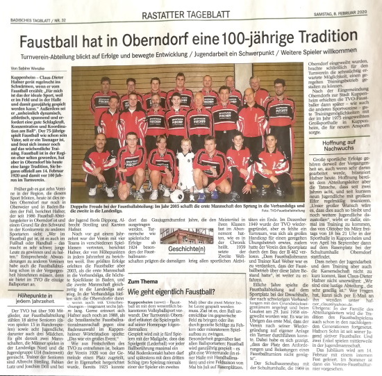 Wir freuen uns über die äußerst gelungenen Artikel vom 8. Februar in der örtlichen Presse (BNN und BT), für dessen Inhalt unser Abteilungsleiter Claus Hafner mit Materialien und Interviews zur Verfügung stand. Claus ist auch der Verfasser des obigen Artikels. Ihm gebührt nicht nur dafür, sondern für das herausragende Engagement in mittlerweile 34 Jahren Abteilungsleitertätigkeit der allergrößte Dank der Faustballer und des gesamten Turnvereins Oberndorf.