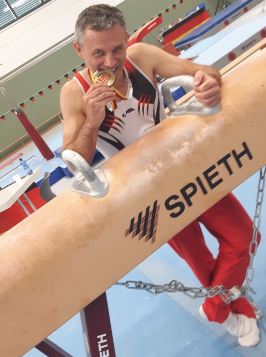 (Markkleeburg) Unerwartete Erfolge im Sport zu feiern sind ohne Zweifel emotionale Momente. Wenn ein Sportler dann noch bei einer Deutschen Meisterschaft überraschend als Deutscher Meister geehrt wird sind das sicherlich Augenblicke, die kein Athlet je vergessen wird. Für Dirk Walterspacher vom TV Oberndorf ist am vergangenen Sonntag ein solcher Traum Realität geworden. Der 49-Jährige ist Deutscher Meister im Gerätturnen in der Altersklasse 45-49. Mit insgesamt 46,60 Punkten nach vier gewerteten Geräten hat Walterspacher fast einen Punkt Vorsprung auf den Zweitplatzierten. Ausschlaggebend für den Erfolg des ehemaligen Bundesligaturners war die Konstanz an allen Geräten, an denen er jeweils mehr als 11,50 Punkte erzielt hat. Besonders stark präsentierte sich Walterspacher am Barren, an dem er mit 11,95 Punkten sein bestes Geräteergebnis erturnt hat. Seine Kür-Übung am Reck bewerteten die Kampfrichter mit 11,60 Zählern, auch die Wertungen am Pauschenpferd mit 11,55 Punkten und am Boden mit 11,50 Punkten zeugen von der Ausgeglichenheit Walterspachers. Vor allem am Pauschenpferd und am Reck setzte Walterspacher seine Grundlagen für den Titelgewinn. Mit 2,15 bzw. 1,4 Punkten Vorsprung distanzierte er die Konkurrenten deutlich. „Dieser 15. Mai war sicherlich einer meiner emotionalsten Momenten in meinem Turnerleben“ konstatierte Walterspacher kurz nach der Siegerehrung im sächsischen Markkleeberg.„Vor drei Wochen war ich noch gar nicht gemeldet und wollte mich nach meinem Badischen Meistertitel einfach nochmals bei den Senioren in der Deutschen Spitze messen. Dass ich nun mit meiner Goldmedaille nach Hause komme ist einfach unfassbar“ ergänzt der Pädagoge doch sehr emotional. Zu den Titelkämpfen waren in verschiedenen Altersklassen nahezu 250 Turner/innen angetreten.