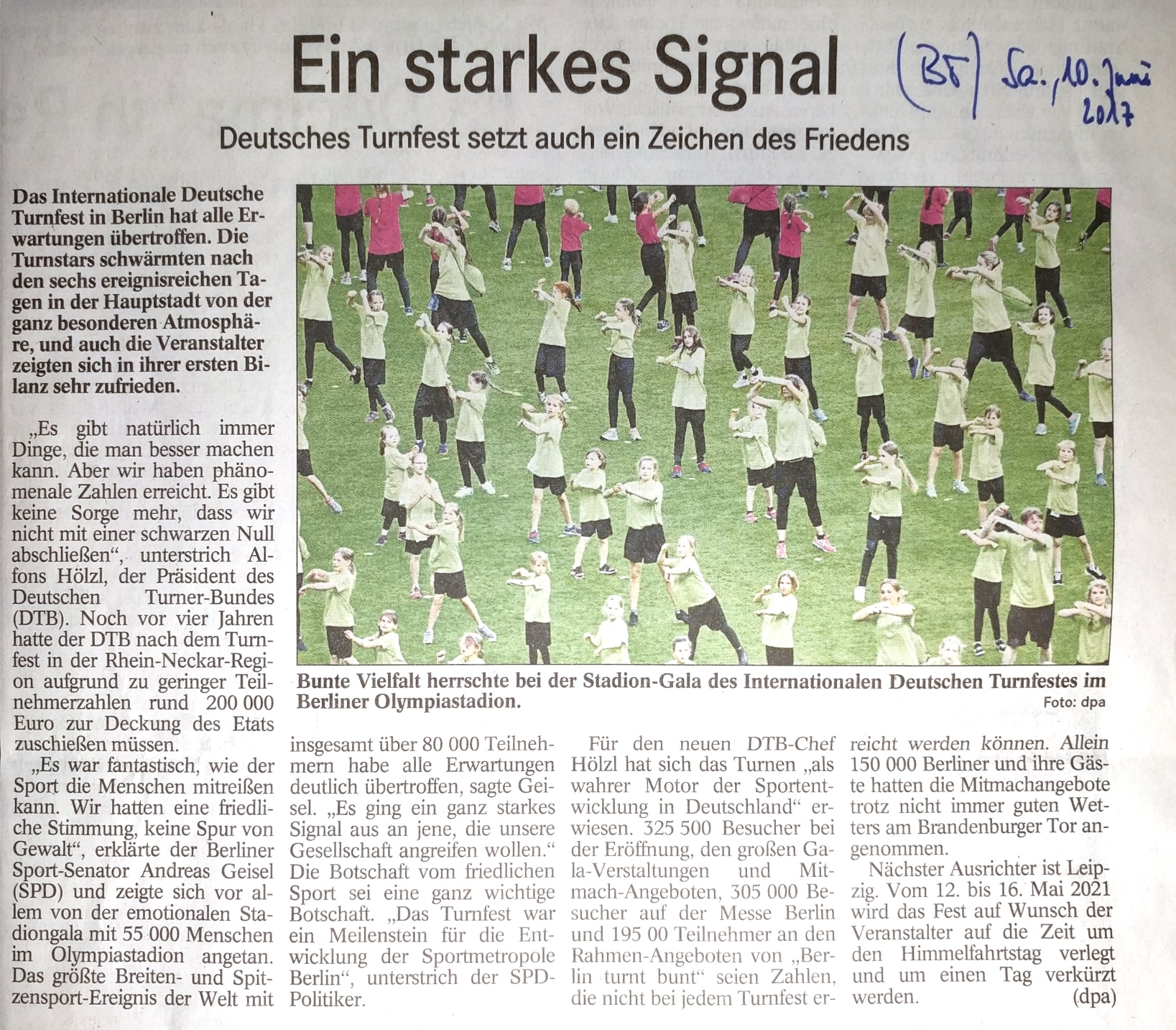 Höhepunkt war für viele die Gala im Olympiastadion, ein farbenfrohes Spektakel mit mehreren tausend Teilnehmern, die auf dem Rasen ein wahres Feuerwerk des Turnsports abfackelten, das nur von den echten Raketen übertroffen wurden, die zum Finale den Nachthimmel über dem Dach der Arena erleuchteten. Bundeskanzlerin Angela Merkel nutze den Rahmen, um zu seinem Karriereende die Verdienste von Turnstar Fabian Hambüchen zu würdigen. Gänsehaut im weiten Stadionrund.