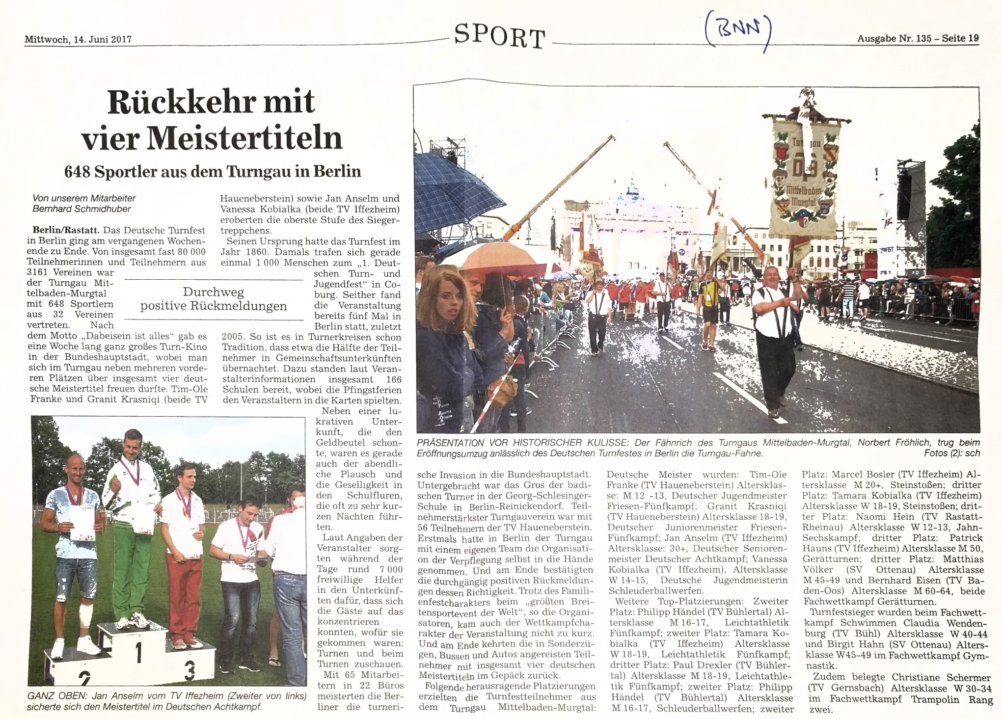 Viel Stimmung herrschte aber auch bei den Wettkämpfen, unter anderem dank der Oberndorfer. So fuhr am Rand des Faustballspielfelds der TVO-Partyzug, eine kleine choreografierte Fanparade. Die brüllte die Oberndorfer auf Platz 35 im 74 Mannschaften starken Teilnehmerfeld. Die Leistungsturner versuchten, beim Orientierungslauf rund um die Museumsinsel zügig zu laufen und zu navigieren - was mal mehr, mal weniger gut gelang. Am Ende stand Rang 18. Turnerisch hielt Markus Mauck die Fahne hoch, der sich bei seinem Pokalwettbewerb auch nicht davon aus der Ruhe bringen ließ, dass der mal eben knapp fünf Stunden dauerte. Auch dank des TVO-Fanzugs landete er auf einem hervorragenden achten Platz. Liane Westermann, Cédric Westermann, Diana Maier und Xenia Maier absolvierten den Drei-Kilometer-Turnfest-Lauf, für den es keine Platzierungen gab. Schließlich startete Rosalie Schmidt im Trampolinturnen (für den TV Gernsbach) und erzielte in ihrer Altersklasse den 22. Platz.